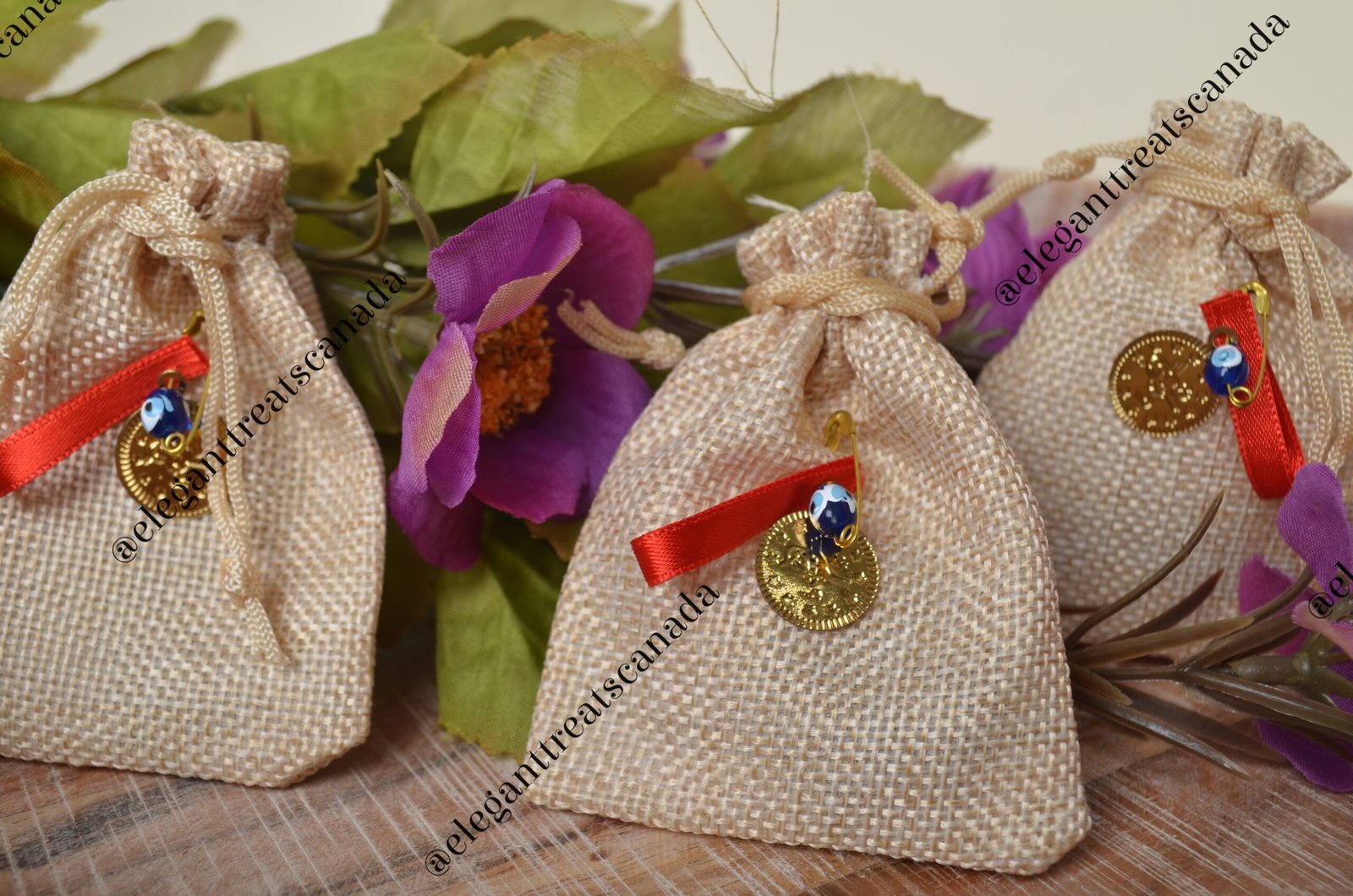 Red and gold velvet pouches decorated with ribbon, evil eye, and golden coin, filled with fresh henna. Great favours for henna party/ Mehendi ceremony,