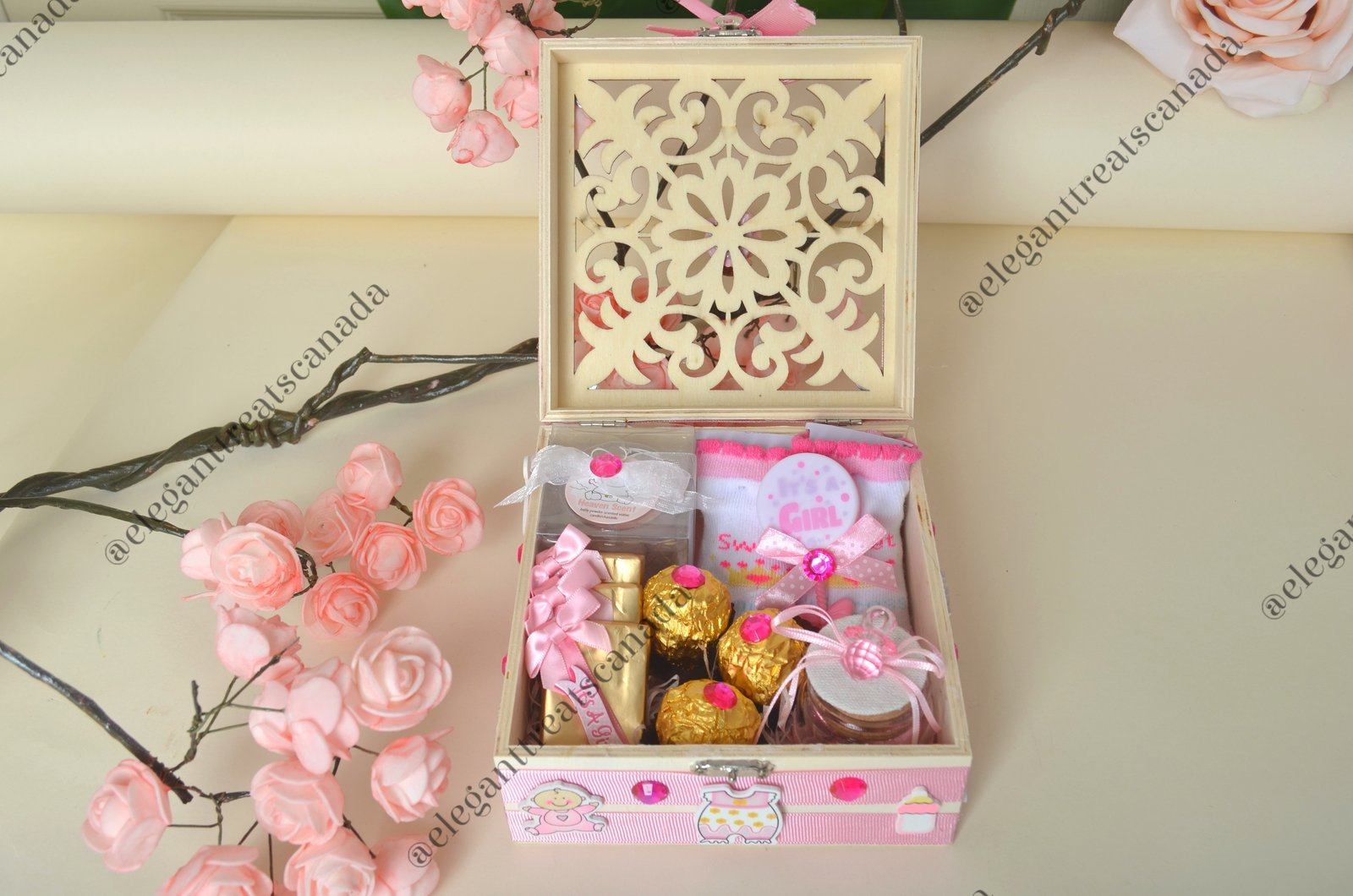 Handmade wooden box filled with decorated chocolates, glass jar of chocolates, scented candle,, baby socks, and decorative baby rattle.
